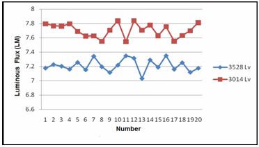 為了保證可對(duì)比性,采用相同的物料(相同的芯片、固晶膠、金線(xiàn)、硅膠、熒光粉,)分別對(duì)3528 LED及3014LED進(jìn)行封裝,制作色溫、色坐標(biāo)相近的LED燈珠,以便更好的進(jìn)行亮度、光衰及色坐標(biāo)等光學(xué)特性的比較分析。