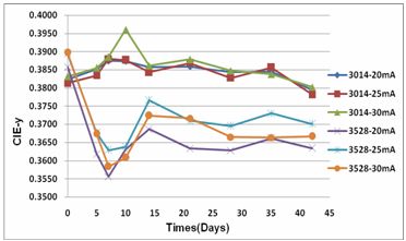 隨機(jī)抽取3528LED和3014LED各30pcs,按驅(qū)動(dòng)電流20mA、25mA、30mA各分為三組進(jìn)行1008H的光衰實(shí)驗(yàn),以比較分析兩種不同散熱模式LED的光衰和色坐標(biāo)漂移程度,從而研究散熱對(duì)其光色特性的影響。