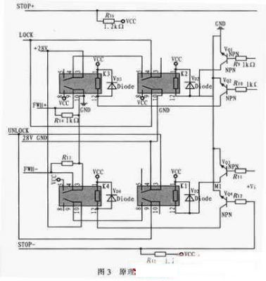 當信號D0-D5為10000時,單片機通過P10口對方位鎖定機構(gòu)發(fā)出加鎖命令,控制命令經(jīng)SN54LS245驅(qū)動后作用于R9和VQ1,VQ1導通后,繼電器K2的4、5導通,輸出+28 VLOCK信號控制電機進行加鎖。完全鎖定后,光電開關輸出(上)信號輸出高電平即圖3中STOP+,STOP+通過上拉電阻R16作用于R10和VQ2,VQ2導通后,繼電器K3的4、5和8、9導通,+28 V LOCK信號切斷,硬件上先停止加鎖控制,防止造成機構(gòu)硬件損傷。而K3的8、9導通后,F(xiàn)WH+輸出+5 V電平給單片機,單片機接收信號后,終止加鎖命令,VQ1截止,K3恢復常態(tài)。解鎖過程和加鎖過程類似,在此不作贅述。