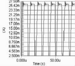 要保證PWM 周期小于電感的τ 時間, 因為若PWM 的周期大于τ, 則極有可能出現(xiàn)在PWM 的占空比變化的情況下, 電路中電流都能達到電感的飽和直流電流, 影響了對LED 電流調(diào)節(jié)。當C8051330 的時鐘頻率是25 MHz ,PWM 的周期的選擇對電流改變檔位的影響很大。若周期越大, 則PWM 占空比的檔位越多, 反之越少。擬用256 個檔位的占空比, 因此PWM 波的頻率應選擇在100kHz 以下,即周期在10 μs 以上,直流電感為10Ω, 此時電感值應選擇大于0.1 mH.圖2 分別是PWM 頻率為100kHz , 占空比為90%, 電感為0.1 mH、1 mH 和40 mH 時電路電流值的模擬結果。