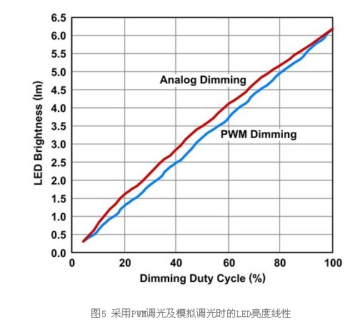 此外,驅(qū)動器可達(dá)到較高的光電轉(zhuǎn)換效率,這表示耗用相同的電力可達(dá)到更高的流明。然而,模擬調(diào)光也有深度調(diào)光的某些電流準(zhǔn)確度問題,此因回饋調(diào)節(jié)電壓或電流汲入電壓過小,而無法準(zhǔn)確控制,此乃受限于錯誤放大器的偏移電壓所致。亮度線性及色度也不比PWM調(diào)光,尤其是在深度調(diào)光時(圖5)。事實上,除非將兩個相同的顯示器并置進(jìn)行比較,否則一般人很難辨別色度或線性的差異。