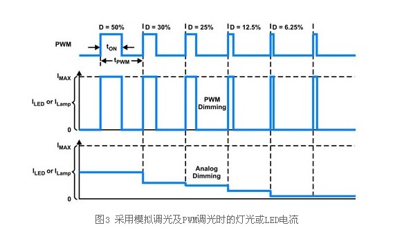 為提升顯示效果,并優(yōu)化不同環(huán)境照明亮度的LED驅(qū)動器效率,較新型LED背光電子裝置能達(dá)到較大的調(diào)光范圍。有兩種方法可用于LED調(diào)光:脈沖寬度調(diào)變(PWM)調(diào)光及模擬調(diào)光(圖3)。