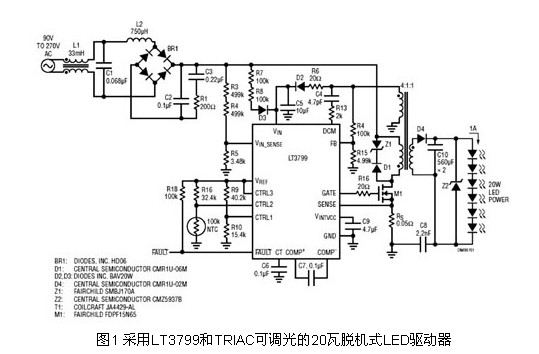 為了滿足脫機(jī)式照明的要求,例如高功率因子、高效率、隔離和TRIAC調(diào)光器兼容性,先前的LED驅(qū)動(dòng)器采用很多外部分立式組件,結(jié)果形成了既龐大又復(fù)雜的解決方案。而最新的驅(qū)動(dòng)器LT3799則整合了脫機(jī)式LED照明需要的所有功能,解決了相關(guān)復(fù)雜性、空間和效能問題。LT3799是一款具主動(dòng)功率因子校正的隔離反馳式LED控制器,專門為在90~265VAC的通用輸入范圍驅(qū)動(dòng)LED而設(shè)計(jì)。該組件以關(guān)鍵導(dǎo)通(邊界)模式控制一個(gè)隔離反馳式轉(zhuǎn)換器,適用于需要4~100瓦或更高LED功率的LED應(yīng)用。其新穎的電流檢測(cè)電路無(wú)須使用光耦合器,就能向二次側(cè)提供良好調(diào)節(jié)的輸出電流。其獨(dú)特的泄能(Bleeder)電路使得LED驅(qū)動(dòng)器可與TRIAC調(diào)光器兼容,而無(wú)須增設(shè)額外的組件。LED開路和短路保護(hù)則可確保長(zhǎng)期可靠性。