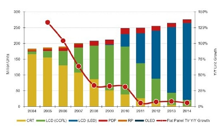 2004-2014全球電視按技術(shù)別出貨量及預(yù)測(單位:百萬臺)