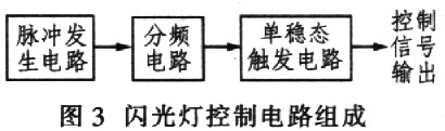 控制電路需要根據(jù)不同的要求進行不同的設(shè)計。對于閃光功能變化復(fù)雜的控制電路可使用MCU單片機進行控制,這樣控制方便、簡單、穩(wěn)定。由于本系統(tǒng)設(shè)計只要求閃光燈定時閃爍,功能單一,故采用簡單的純硬件電路實現(xiàn)。電路組成如圖3所示。