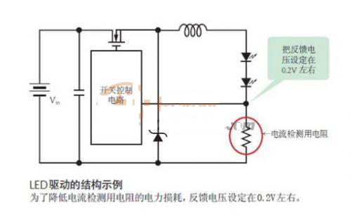 通常,開關(guān)穩(wěn)壓器IC設(shè)定的反饋電壓約為1.2V。但對于LED驅(qū)動IC,1.2V過大。因?yàn)榘演敵鲭娏鬓D(zhuǎn)換成電壓的數(shù)百mΩ 的電阻(電流檢測用電阻)需要與LED串聯(lián)。對于照明器具等使用的高亮度LED,流經(jīng)的是1.5A和2A等大電流。如果500mΩ的電流檢測用電阻中通過1.5A的電流,僅此一項(xiàng)就會產(chǎn)生0.75W的電力損耗。因此,LED驅(qū)動IC把反饋電壓設(shè)定在了非常低的0.2V左右。這樣一來,不僅可以使用較小的電流檢測用電阻,而且在大電流通過時(shí),也可以把電力損耗控制在較低的水平。