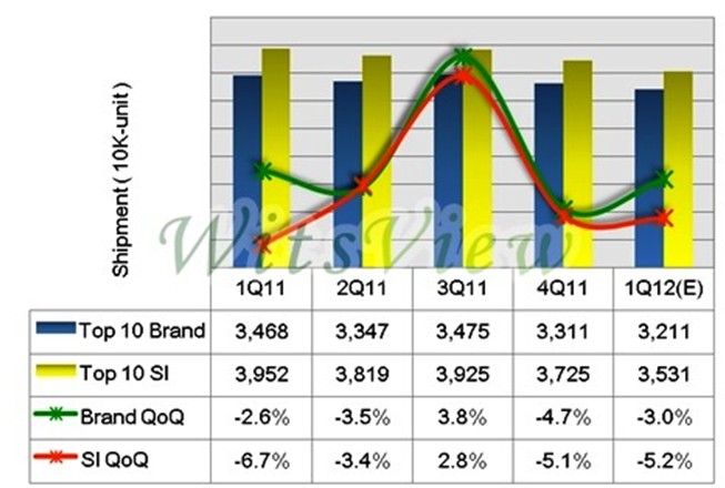 WitsView表示,衰退主因為 2011年第四季部分需求提前于第三季底反應(yīng),而終端銷售受到歐洲債信風暴持續(xù)發(fā)酵,以及全球經(jīng)濟動能復(fù)蘇遲緩的影響,通路拉貨力道無法延續(xù);其次,面板價格雖于第四季止跌,但在終端需求疲軟下,反彈動能受到壓抑,使得品牌及通路商無提前備貨需要;再者,部份2012中國春節(jié)需求提前至2011第四季反應(yīng),但多數(shù)代工及品牌廠考量年底的庫存盤點壓力,而必須進行庫存水位與出貨的調(diào)整。