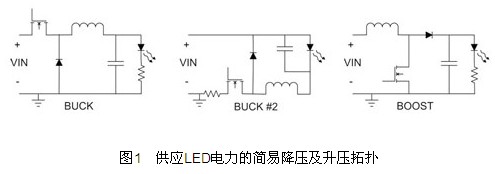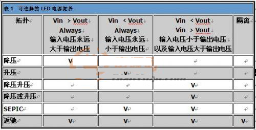 表1的信息可供作選擇LED驅動器最佳切換拓撲的參考。除了這些拓撲之外,也可以使用簡單的電流限制電阻或是線性穩(wěn)壓器,不過這些方法通常會耗用過多功率。輸入電壓范圍、驅動的LED數目、LED電流、隔離、電磁干擾(EMI)限制以及效能,都是相關的設計參數。大部分的LED驅動電路可分為以下幾種拓撲類別:降壓、升壓、降壓升壓、SEPIC以及返馳。