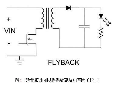 基于安全考慮,可能會規(guī)定在脫機電壓及輸出電壓之間進行隔離。此應用方式下,最節(jié)省成本的解決方法就是使用返馳轉換器(圖4),在所有的隔離拓撲中,這種作法所需要的組件數量最少。變壓器匝數比可用來對輸出電壓進行降壓、升壓或降壓升壓,設計彈性很大,不過缺點在于電源變壓器基本上是訂制組件。此外,在FET以及輸入和輸出電容器中,也會有高組件應力的情形出現。應用固定燈光時,可以使用「慢速」的回饋控制循環(huán),調節(jié)LED電流與輸入電壓同相位的情形,進行功率因子校正(PFC)。這樣可以調節(jié)所需的平均LED電流,并能調節(jié)輸入電流與輸入電壓同相位的情形,以提供高功率因子。