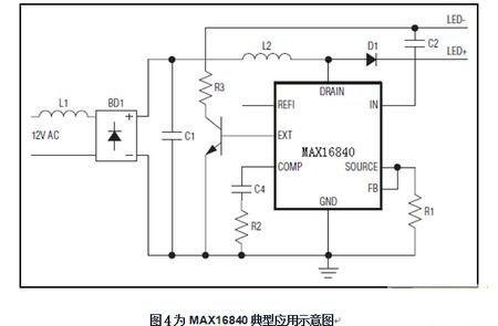 MAX16840具有的應(yīng)用特征是LED換代燈構(gòu)建技術(shù)的保證。MAX16840 集成MOSFET LED驅(qū)動器,可用于MR16及其它12V交流輸入燈。它采用獨(dú)特的技術(shù)控制燈管的輸入電流,對輸入電流進(jìn)行整形,可使用大多數(shù)電子變壓器和調(diào)光器支持無閃爍工作,很好地解決了上述“問題的提出”之困擾。