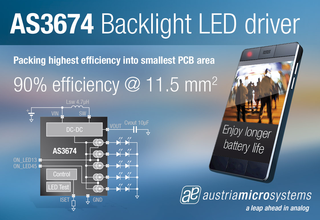 全球領先的高性能模擬IC設計者及制造商奧地利微電子公司(SIX股票代碼:AMS)宣布推出應用于智能手機LCD顯示屏的AS3674及AS3490兩款LED背光燈驅動器芯片。新品具有業(yè)內最高效能,峰值可達90%,包括DC-DC轉換器和電流源。PCB封裝僅為11.5 mm2 ,并只需4個外接組件。AS3674及AS3490非常適合應用于智能手機和其他將空間列為首要需求的移動設備。