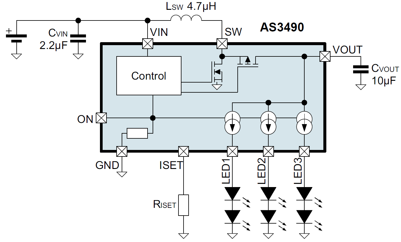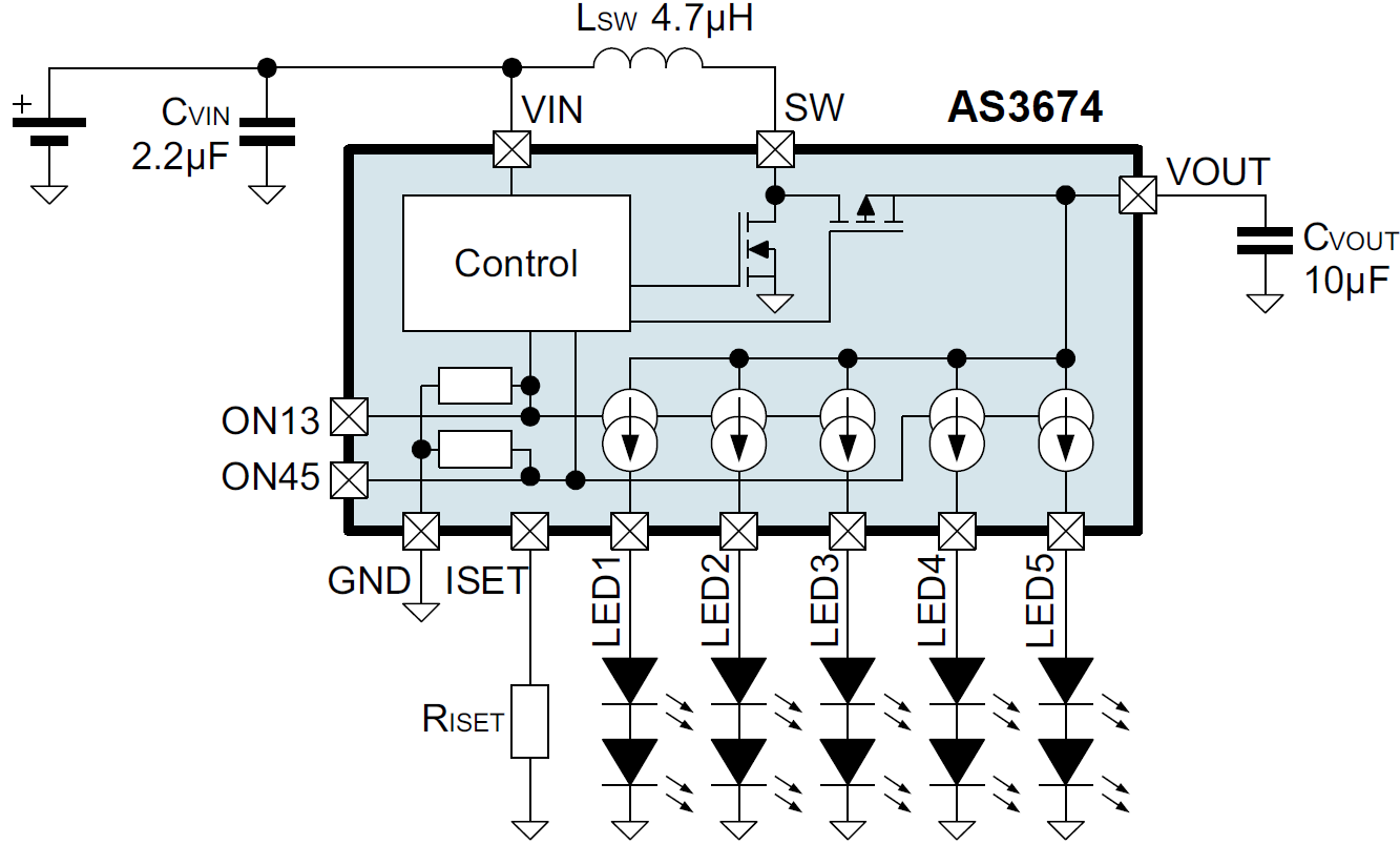 軟啟動的特點使AS3674更容易集成到對噪音敏感的無線射頻系統(tǒng)中。AS3674由兩組輸入電路控制,也可用介于100-800赫茲的PWM電路控制,實現(xiàn)1:2000的調光比。單通道兩個LED的配置結合2 MHz的轉換器操作頻率,實現(xiàn)使用諸如4.7µH電感的微小外部組件并取得優(yōu)于競爭對手最高達6%的高效率。