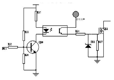為了在夜間不同時刻采用不同的亮度,以達(dá)到節(jié)約電能的目的,本系統(tǒng)設(shè)計了兩路負(fù)載輸出,晚上12點(diǎn)以前兩盞LED皆亮,12點(diǎn)后一盞點(diǎn)亮,每路輸出均有立的控制和檢測。設(shè)計采用了PWM功率控制功能對LED燈具實現(xiàn)無級調(diào)光。單路原理如圖3所示。其中單片機(jī)P0.6 口給出控制信號, 即P 0 . 6 = 1 時, 三極管導(dǎo)通,繼電器閉合,MOS管導(dǎo)通,蓄電池向路燈供電。在電量不足或白天時,控制端輸出低電平信號,切斷供電回路。夜晚蓄電池電量不足情況下由市電供電系統(tǒng)給LED路燈供電,保證系統(tǒng)的完整和可靠。