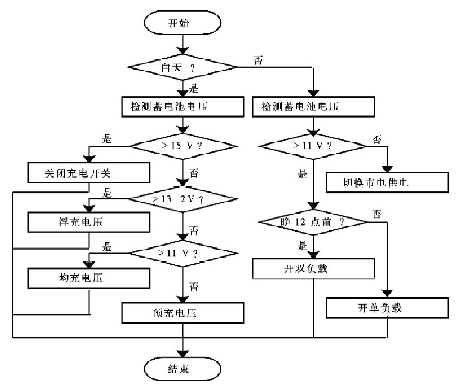 在放電過程中,首先保證在晚上12點(diǎn)前開通兩路負(fù)載,12點(diǎn)后開通一路負(fù)載,并且當(dāng)蓄電池電壓低于保護(hù)電壓(11V)時,控制器自動切換到市電供電系統(tǒng)或關(guān)閉負(fù)載開關(guān)以保護(hù)蓄電池不受損壞。因此,充電管理和放電管理是系統(tǒng)軟件設(shè)計中的主要內(nèi)容,充放電程序流程圖如圖4 所示: