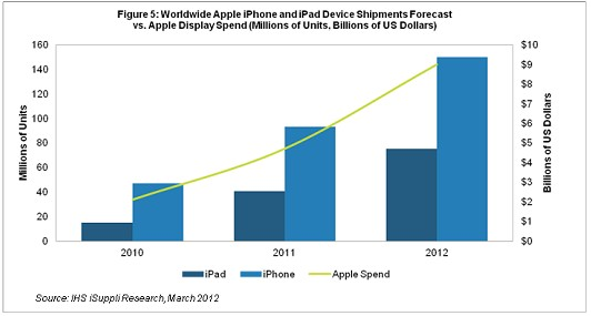 據(jù)IHS iSuppli公司的研究報告,由于預計iPhone和iPad產品出貨量今年大幅增長,蘋果2012年可能在這兩款產品的顯示器面板上面支出90億美元,進一步確保其在平板電腦和手機市場中的主導地位。