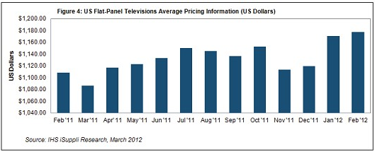 據(jù)IHS iSuppli公司的美國(guó)電視價(jià)格與規(guī)格追蹤報(bào)告,盡管有上年結(jié)轉(zhuǎn)的庫(kù)存,但由于這些庫(kù)存具備高端功能,2月份美國(guó)平板電視價(jià)格連續(xù)第三個(gè)月上漲。