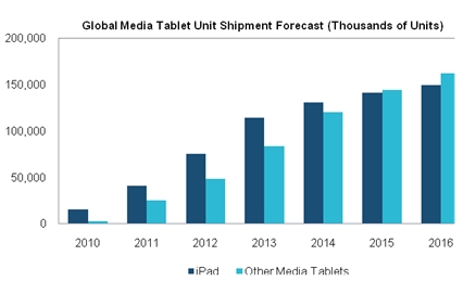 據(jù)IHS iSuppli公司,2012年全年蘋果占全球媒體平板電腦出貨量的份額預(yù)計(jì)為61%,高于2011年第四季度時(shí)的57%。雖然蘋果2012年全年市場份額將略低于2011年的62%,但它將在媒體平板電腦市場保持統(tǒng)治地位,直到2014年,屆時(shí)其出貨量份額仍將高達(dá)52%。