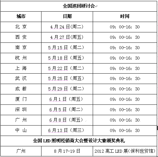 整個(gè)巡回研討會(huì)暨大賽將持續(xù)5個(gè)月時(shí)間,3月份為活動(dòng)啟動(dòng)宣傳階段,4-5月份為全國巡回研討及大賽報(bào)名階段,6‐8 月份為大賽作品提交及評審階段。巡回總結(jié)大會(huì)暨設(shè)計(jì)大賽頒獎(jiǎng)典禮將于2012 高工LED 展期間(8 月17 日)在廣州保利世貿(mào)館召開。