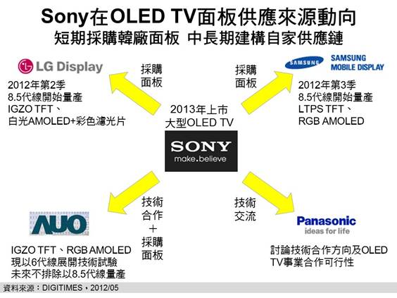 2012年下半至2013年南韓兩大面板廠商因具備大尺寸OLED TV面板量產(chǎn)能力,且Sony具備龐大LCD TV面板采購力(2011年占全球10%)可作談判籌碼,因此黃銘章預(yù)期,南韓面板廠尤其是Samsung面板事業(yè),將會供應(yīng)給Sony所需面板;但中長期而言,南韓三星與LG與Sony在電視市場針鋒相對,因此Sony仍會希望建構(gòu)自家供應(yīng)鏈,此時,具備OLED技術(shù)及大尺寸TFT產(chǎn)能可供轉(zhuǎn)換為OLED生產(chǎn)線的友達,將較有機會打入Sony OLED TV的供應(yīng)鏈中。