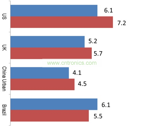 - 主要的家用電視平均壽命在4到7年之間,印度使用年限最久為6.7年,而中國(guó)城市的電視使用年限最短。