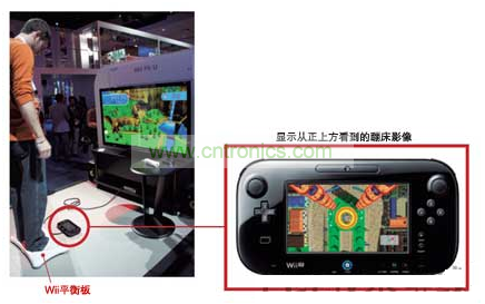 除了改變用戶立場來玩的游戲之外,任天堂還以使用雙屏幕實(shí)現(xiàn)更具臨場感的游戲體驗(yàn)為目標(biāo)。“Wii Fit U”中的蹦床游戲“Trampoline Target”就是一個很好的例子(圖4)??蓪Ⅲw重計式控制器“Wii平衡板”當(dāng)做蹦床來操作。在平衡板旁邊的地板上放置的GamePad的畫面上,會顯示從正上方俯視蹦床的影像,蹦得越高蹦床就會變得越小,越接近蹦床就變得越大。這種顯示方法可使用戶感覺像自己真的在蹦床上彈跳一樣。