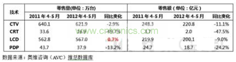AVC預(yù)測:全年電視零售量將達(dá)到4191萬臺,同比增長0.1%。其中,液晶和等離子電視銷量將分別為3807萬臺和280萬臺,同比分別增長2.6%和8.1%,CRT銷量繼續(xù)快速下降到103萬臺,同比下降52.4%。
