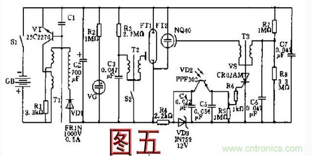 在圖三所示的電路中,在儲(chǔ)能電容器C2所充電壓低于VG的啟輝電壓(一般為25o~27OV)時(shí),VG不點(diǎn)亮,VT4因無基極偏流而截止,振蕩電路工作。當(dāng)c2所充電壓太于VG 的啟輝電壓時(shí),VG點(diǎn)亮,VT4導(dǎo)通,振蕩管VT3截止,此時(shí)電源所消耗的電流基本上由R4決定。當(dāng)C2上的電壓降低時(shí),VG熄滅,VT4截止,VT3又進(jìn)入振蕩工作狀態(tài)。