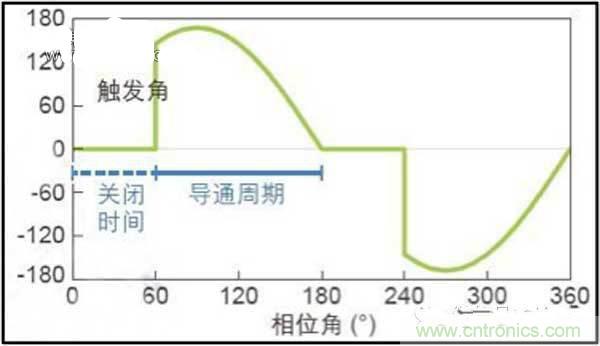 因此前沿切相調(diào)光的特點(diǎn)綜合起來就是:每半周期內(nèi),過零關(guān)斷,延時(shí)導(dǎo)通至半周期末。