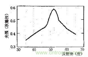 圖5為L(zhǎng)ED發(fā)射光與反射的反射角θ之間的關(guān)系,從圖中可看出當(dāng)反射角為52度的時(shí)候反射光強(qiáng)取得最大。從理論上講,硅凹槽反射角應(yīng)該設(shè)計(jì)為52度。但是,考慮到對(duì)(100)硅進(jìn)行腐蝕的時(shí)候,其(111)面和(100)面會(huì)自動(dòng)形成一個(gè)54.7度的角,而通過(guò)仿真分析結(jié)果可以計(jì)算。當(dāng)反射角為54.7度的時(shí)候。LED的反射光強(qiáng)只比反射角為52度的時(shí)候小12%,而且光強(qiáng)分布也比較接近。因此在腐蝕凹槽的時(shí)候可以直接采用硅的(100)面和(111)面形成角度作為反射角,這可以極大的簡(jiǎn)化加工工藝,降低制造成本,而且對(duì)LED光強(qiáng)的影響也不是很大。