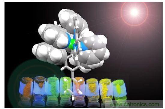銥金屬中心被包覆在一種有機(jī)外殼,為LEC提供保護(hù)作用。這種外殼的精確化學(xué)結(jié)構(gòu)讓研究人員們得以調(diào)整發(fā)光的色彩。(來源:University of Basel)