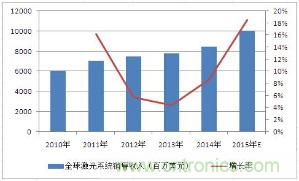 2010---2015年全球激光設(shè)備銷售規(guī)模(單位:百萬美元)