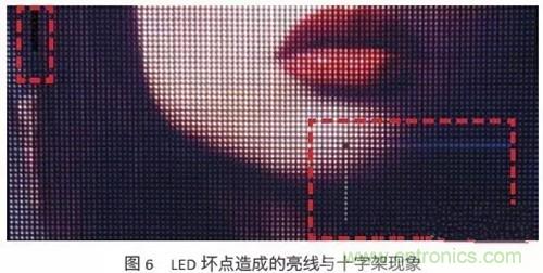 現(xiàn)今的LED磊晶與封裝技術與日俱增,但LED經(jīng)過長時間的使用后仍難免會有損壞,與液晶屏幕不同的是,壞掉的LED會在小點間距LED顯示屏形成亮線或是十字架,而不是一個黑點,如圖6所示。對LED顯示屏制造商,營運商與觀眾而言,都是一大困擾。