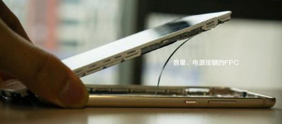 注意音量、電源按鍵的FPC,接口在主板側(cè)。按鍵不直接放在主板上還是有點(diǎn)講究的,因?yàn)榻饘贆C(jī)身遭遇不慎的話可能會變形,而變形后主板與按鍵(鍵帽)之間容易出現(xiàn)錯位從而影響按鍵手感/功能,因此把按鍵整合在后殼上,再用FPC連接主板,怎么摔按鍵也能按。
