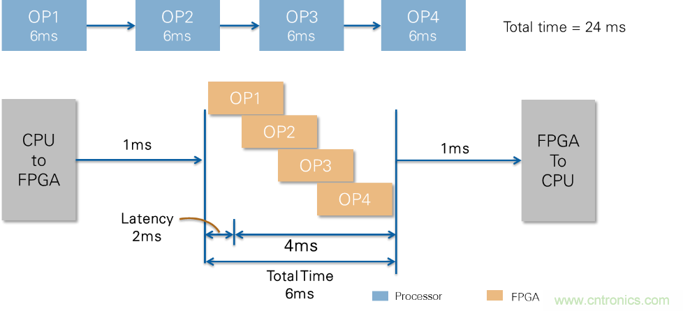 CPU按順序執(zhí)行操作,因此第一個操作必須在整個圖像上運(yùn)行結(jié)束后,第二個操作才能啟動。在本例中,假設(shè)算法中的每個步驟在CPU上運(yùn)行需要6ms;因此,總處理時間是24毫秒。現(xiàn)在考慮在FPGA上運(yùn)行相同的算法。由于FPGA本質(zhì)上是大規(guī)模并行的,所以該算法中的四個操作可以同時對圖像中的不同像素上操作。這意味著接收第一個處理的像素僅需2ms的時間,處理整個圖像需要4ms的時間,因而總處理時間為6ms。這比CPU的執(zhí)行速度快得多。即使使用FPGA協(xié)處理架構(gòu)并將圖像傳輸?shù)紺PU,整個處理時間(包括傳輸時間)也比單獨(dú)使用CPU要短得多。