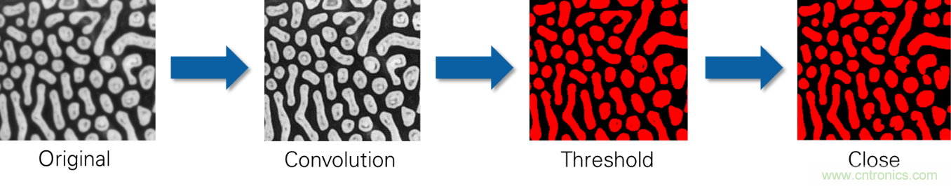 現(xiàn)在考慮一個真實(shí)的例子,比如粒子計數(shù)所需的圖像。首先需要應(yīng)用卷積濾鏡來銳化圖像。接下來,通過閾值運(yùn)行圖像以生成二進(jìn)制圖像。這不僅可以通過將其從8位單色轉(zhuǎn)換為二進(jìn)制來減少圖像中的數(shù)據(jù)量,還可以為二進(jìn)制形態(tài)學(xué)應(yīng)用準(zhǔn)備圖像。最后一步是使用形態(tài)學(xué)來應(yīng)用關(guān)閉功能。這會去除二進(jìn)制粒子中的任何孔。