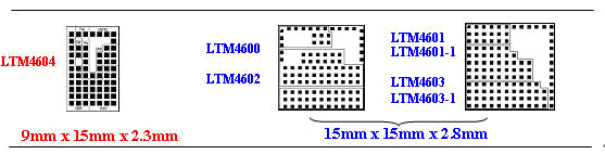 由于 LTM4604 以較低電壓和較低功率工作,因此這個(gè)器件采用了更小和更薄的 LGA 封裝,與第一個(gè)系列的器件相比,LTM4604 占板面積小 40%,薄 18%。第一個(gè)系列的器件具有更高的功率和更高的電壓(LTM4600、LTM4601 和 LTM4603)。圖 2 比較了這些器件的相對尺寸(占用面積)。