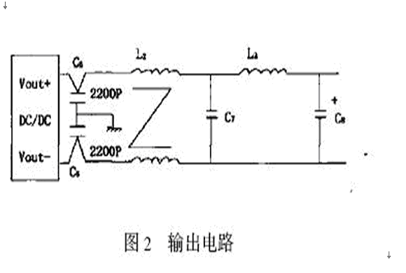 二次電源的輸出高頻噪聲(表現(xiàn)為紋波)可能向空間輻射成為輻射噪聲,過(guò)大時(shí)造成作為負(fù)載的電子設(shè)備出現(xiàn)故障。為此,二次直流電源的輸出應(yīng)包括平滑電路和EMI濾波電路。電路圖如圖2所示。