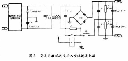 交流輸入220V時(shí),整流采用橋式整流電路。如果將JTI跳線短連時(shí),則適用于110V交流輸入電壓。由于輸入電壓高,電容器容量大,因此在接通電網(wǎng)瞬間會(huì)產(chǎn)生很大的浪涌沖擊電流,一般浪涌電流值為穩(wěn)態(tài)電流的數(shù)十倍。這可能造成整流橋和輸入保險(xiǎn)絲的損壞,也可能造成高頻變壓器磁芯飽和損壞功率器件,造成高壓電解電容使用壽命降低等。所以在整流橋前加入由電阻R1和繼電器K1組成的輸入軟啟動(dòng)電路。