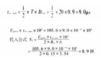 計(jì)算原副邊繞組匝數(shù):按輸入電壓最低及輸出滿載的情況(此時(shí)占空比最大)來計(jì)算原副邊繞組匝數(shù),已知Umin=176V經(jīng)整流濾波后直流輸入電壓Udmin=1.2×176=211.2V。