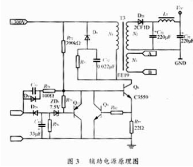 輔助電源采用RCC變換器(RingingChokeConverter),見圖3。其輸入電壓為交流220V整流濾波電壓,輸出直流電壓為12.5V,輸出直流電流為0.5A。電路中Q8和變壓器初級繞組線圈N1與反饋繞組線圈N3構(gòu)成自激振蕩。R72為啟動(dòng)電阻。Q9、R77構(gòu)成輔助電源初級過流保護(hù)。D20、C81、ZD1、Q11、R75、R76構(gòu)成電壓檢測與穩(wěn)壓電路,控制Q8的基極電流的直流分量,從而保持輸出電壓恒定,變壓器采用EE19、LP3材質(zhì)構(gòu)成。初級180匝,反饋繞組5.5匝,次級11匝,初級電感量是2.6mH,磁芯中間留有間隙0.4mm。