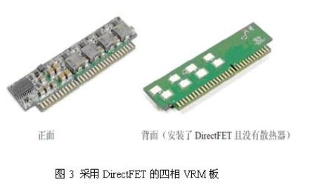 為了演示此項(xiàng)新型封裝工藝在VRM設(shè)計(jì)中所帶來(lái)的好處,我們利用DirectFET MOSFET設(shè)計(jì)了一個(gè)高電流四相VRM。6層電路板的每一層采用了4盎司銅箔。其四相控制器和驅(qū)動(dòng)器的工作速度可高達(dá)2MHz/相位。為減小外形尺寸,該設(shè)計(jì)的輸入和輸出濾波器均采用了陶瓷電容器,電感器則采用了一個(gè)400nH的高電流、小占位面積線(xiàn)圈(10mm×10mm)。