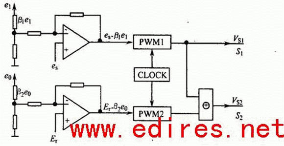 es = i1Rs 壓降,與β1e1 經(jīng)加減運(yùn)算電路后得es-β1e1 并送入PWM 1控制器。 其輸出Vs1作為開(kāi)關(guān)管S1 的驅(qū)動(dòng)信號(hào),S1的導(dǎo)通時(shí)間為T(mén)on1。它采用的是前饋控制,目的是把e1 和i1的擾動(dòng)所引起的系統(tǒng)瞬態(tài)誤差減到最小,以改善系統(tǒng)的瞬態(tài)響應(yīng)。