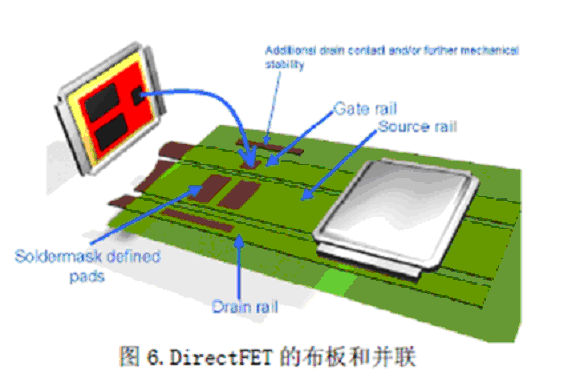 采用單面冷卻的SO-8方案,設計者考慮散熱問題時有一些可選的方法:當每相的電流值達到上限時,他們可以增加相數(shù),而依目前的技術,超過4相是不現(xiàn)實的。而且增加了成本和所占空間。也可考慮熱管,加風扇增大冷卻氣流,更大尺寸的線路板或更多的覆銅。這些方案都將增加系統(tǒng)成本。DirectFET給設計者一個新的選擇,既能夠滿足電路性能,外形尺寸和預算要求,同時省掉50%或更多上面討論的用于標準的或其它派生的SO-8封裝可選散熱方案中的花費。DirectFET MOSFET容易布版和并聯(lián),可以簡化布局減小PCB板寄生損耗(見圖六)