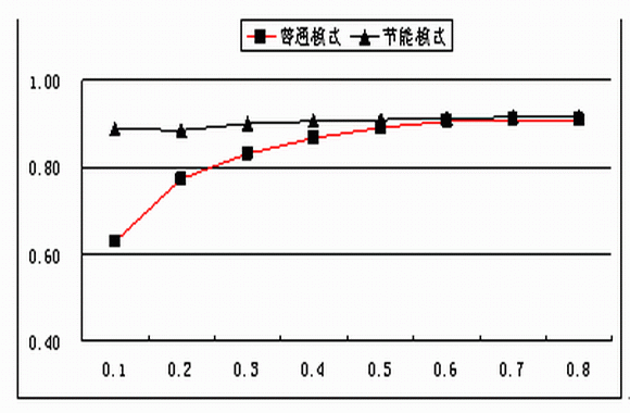 針對(duì)電源部分的損耗,戶外電源的工作模式和室內(nèi)電源是一樣的,正常情況下為均流工作模式。市電正常時(shí)模塊負(fù)載率較低,電源系統(tǒng)大多數(shù)沒(méi)有工作在系統(tǒng)最佳效率區(qū)間,因此可以采用電源模塊休眠技術(shù)根據(jù)系統(tǒng)負(fù)載狀態(tài),動(dòng)態(tài)調(diào)整工作模塊數(shù)量,使系統(tǒng)始終工作在最佳效率區(qū)間,從而降低系統(tǒng)的能耗。圖1表示了電源系統(tǒng)在普通工作模式下和節(jié)能模式下的系統(tǒng)典型效率比較。從圖1可看出,采用休眠節(jié)能模式,電源系統(tǒng)的效率在整個(gè)負(fù)載范圍內(nèi)基本保持不變,有效的降低了電源系統(tǒng)在低負(fù)載條件下的能耗。另一方面,對(duì)于戶外電源來(lái)說(shuō),電源系統(tǒng)效率提高會(huì)降低設(shè)備倉(cāng)的發(fā)熱量,降低設(shè)備倉(cāng)的溫度。
