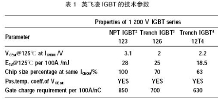 英飛凌的3 個(gè)主要IGBT 技術(shù)系列的最重要的專(zhuān)用參數(shù)如表1 所列,它們都為1 200 V SEMI原TRANS模塊所使用。