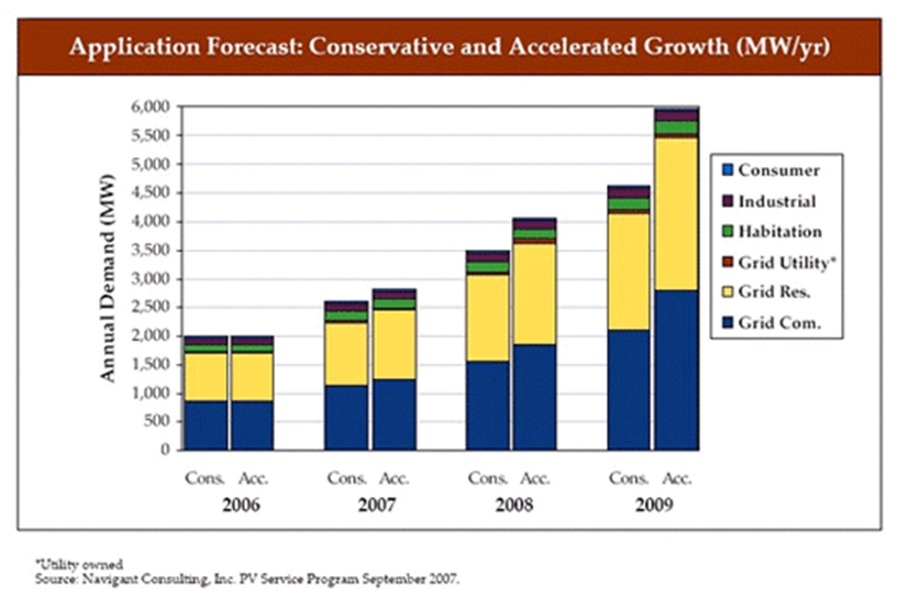 中國(guó)政府在《可再生能源長(zhǎng)期規(guī)劃》提出,太陽能光伏發(fā)電裝機(jī)容量到2010年將發(fā)展到450MWp,而2005年全國(guó)太陽能發(fā)電裝機(jī)容量?jī)H為6.5MWp,這就意味著中國(guó)太陽能裝機(jī)容量的復(fù)合增長(zhǎng)率將會(huì)高達(dá)38%以上。了解目前太陽能光伏市場(chǎng)發(fā)展動(dòng)態(tài),把握太陽能光伏行業(yè)發(fā)展趨勢(shì),對(duì)于半導(dǎo)體行業(yè)的發(fā)展是至關(guān)重要的。