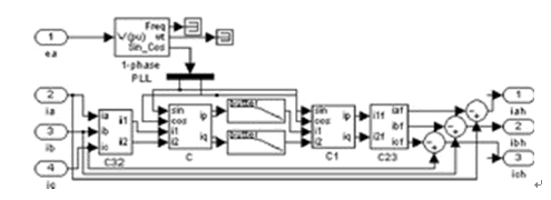 該有源濾波器主要由諧波電流檢測(cè)電路、驅(qū)動(dòng)電路、主電路、電容器和變壓器5大部分組成。變壓器的設(shè)置主要是為調(diào)節(jié)有源電力濾波器交流側(cè)電壓之用。其原理如圖1所示。其中的諧波源模塊是根據(jù)主提升機(jī)房實(shí)際諧波測(cè)試數(shù)據(jù)建成的。