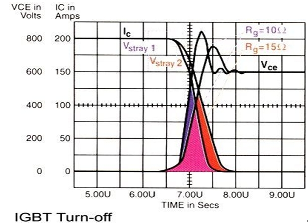 每個(gè)IGBT開關(guān)特性的設(shè)定可受外部電阻RG的影響。由于IGBT的輸入電容在開關(guān)期間是變化的,必須被充放電,柵極電阻通過限制導(dǎo)通和關(guān)斷期間柵極電流(IG)脈沖的幅值來決定充放電多長時(shí)間(見圖1)。由于柵極峰值電流的增加,導(dǎo)通和關(guān)斷的時(shí)間將會(huì)縮短且開關(guān)損耗也將會(huì)減少。減小RG(on)和RG(off)的阻值會(huì)增大柵極峰值電流。當(dāng)減小柵極電阻的阻值時(shí),需要考慮的是當(dāng)大電流被過快地切換時(shí)所產(chǎn)生的電流隨時(shí)間變化特性di/dt。電路中存在雜散電感在IGBT上產(chǎn)生大的電壓尖峰。這一效果可在圖2所示的IGBT關(guān)斷時(shí)波形圖中觀察到。圖中的陰影部分顯示了關(guān)斷損耗的相對(duì)值。集電極-發(fā)射極電壓上的瞬間電壓尖峰可能會(huì)損壞IGBT,特別是在短路關(guān)斷操作的情況下,因?yàn)閐i/dt比較大。可通過增加?xùn)艠O電阻的值來減小Vstray。因此,消除了由于過電壓而帶來的IGBT被損毀的風(fēng)險(xiǎn)??焖俚膶?dǎo)通和關(guān)斷會(huì)分別帶來較高的dv/dt和di/dt,因此會(huì)產(chǎn)生更多的電磁干擾(EMI),從而可能導(dǎo)致電路故障。表1顯示不同的柵極電阻值對(duì)di/dt的影響。