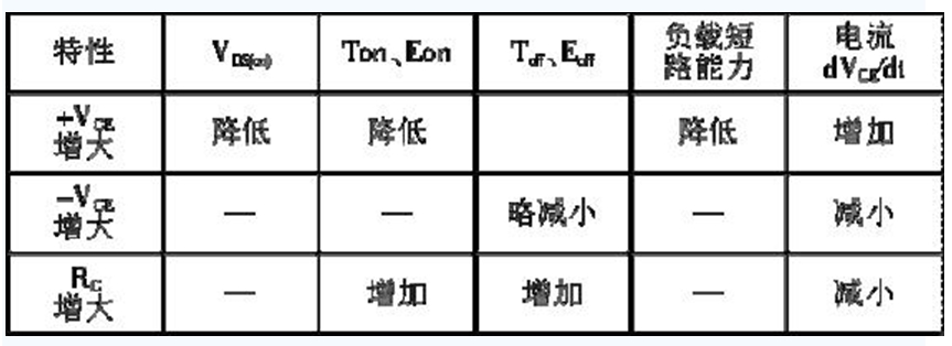 IGBT 的驅(qū)動(dòng)條件與它的靜態(tài)和動(dòng)態(tài)特性密切相關(guān)。柵極的正偏壓+VGE、負(fù)偏壓-VGE 和柵極電阻RG 的大小,對(duì)IGBT 的通態(tài)電壓、開(kāi)關(guān)時(shí)間、開(kāi)關(guān)損耗、承受短路能力以及dVCE/dt等參數(shù)都有不同程度的影響。門(mén)極驅(qū)動(dòng)條件與器件特性的關(guān)系如表1 所示。
