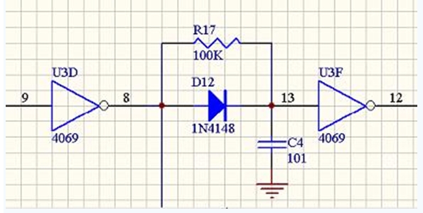 這個電路要求在IN端輸入的是邊緣陡峭的方波脈沖,因此控制信號從單片機或者其他開路輸出的設備接入后,要經過施密特觸發(fā)器(比如555)或者推挽輸出的高速比較器才能接到IN端。如果輸入邊緣過緩,二極管延時電路也就失去了作用。